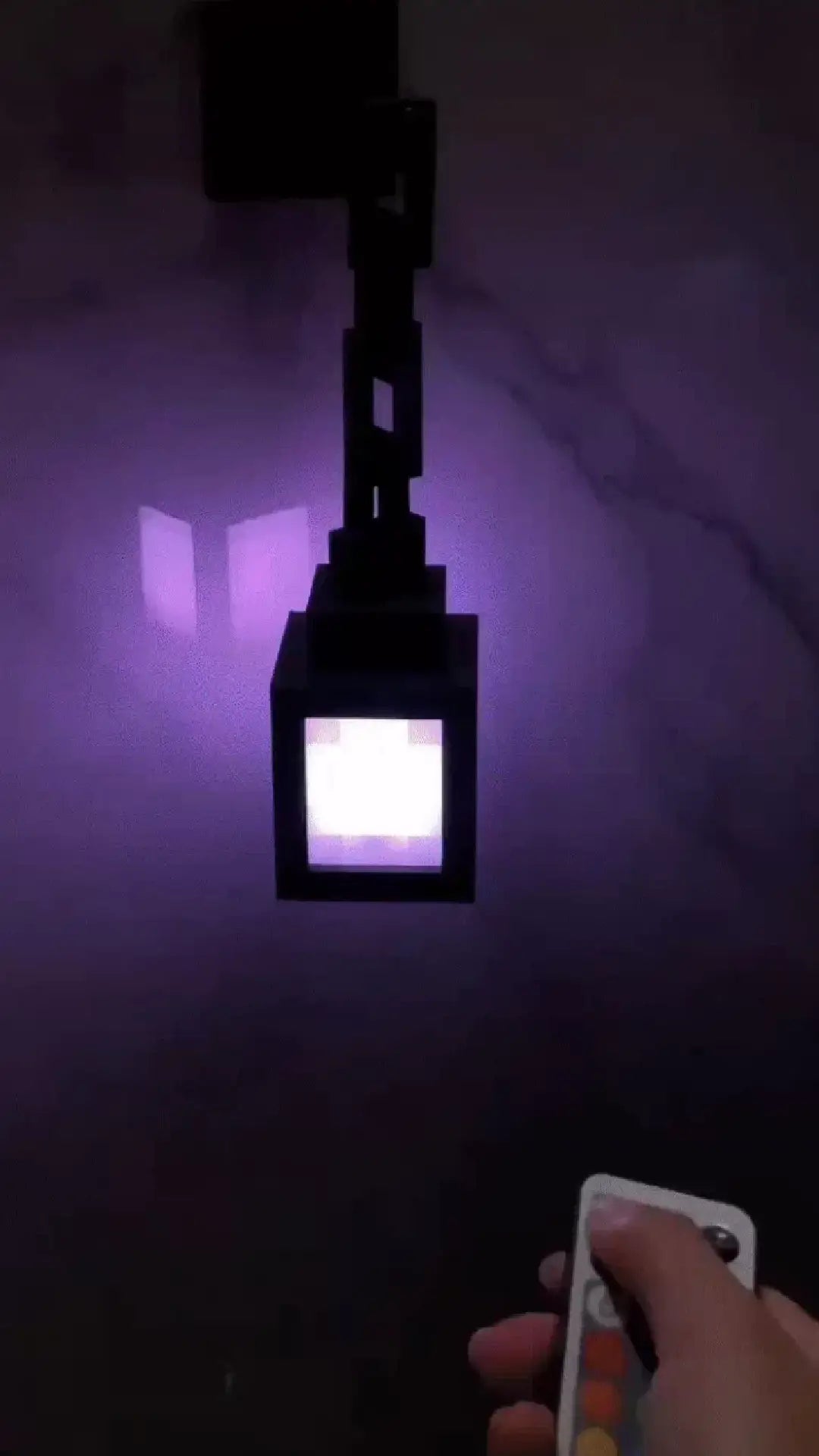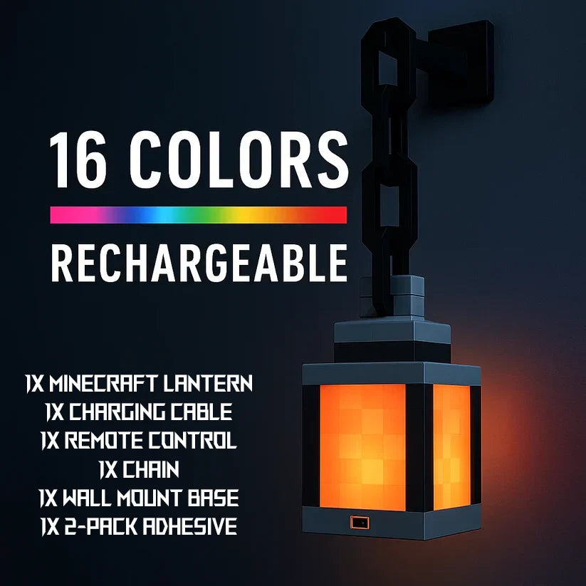 You get the MineLantern Torch, a metal chain, wall mount base, USB charging cable, 2 secure wall adhesives, and a remote control with 16 colors — everything you need to start using it right away.